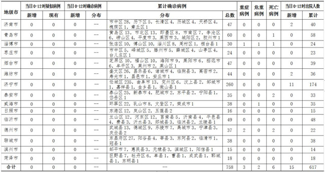 ??????2020年3月6日0-12時,山東省無新冠肺炎疑似病例;無新增確診病例,累計確診病例758例(其中,重癥病例3例,危重癥病例2例,死亡病例6例);新增治愈出院15例,累計治愈出院617例。截至目前,追蹤到密切接觸者16996人,尚有193人正在接受醫學觀察。