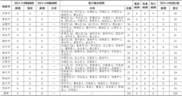 ??????2020年3月8日0-12時,山東省無新冠肺炎疑似病例;無新增確診病例,累計確診病例758例(其中,無重癥病例,危重癥病例2例,死亡病例6例);新增治愈出院1例,累計治愈出院638例。截至目前,追蹤到密切接觸者17010人,尚有130人正在接受醫學觀察。