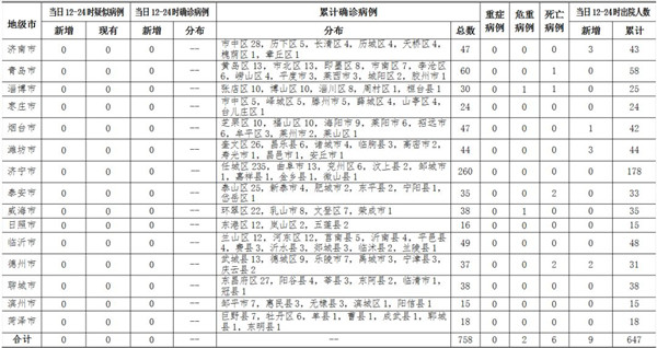 2020年3月8日12-24時,山東省無新冠肺炎疑似病例;無新增確診病例,累計確診病例758例(其中,無重癥病例,危重癥病例2例,死亡病例6例);新增治愈出院9例,累計治愈出院647例。截至目前,追蹤到密切接觸者17010人,尚有121人正在接受醫學觀察。