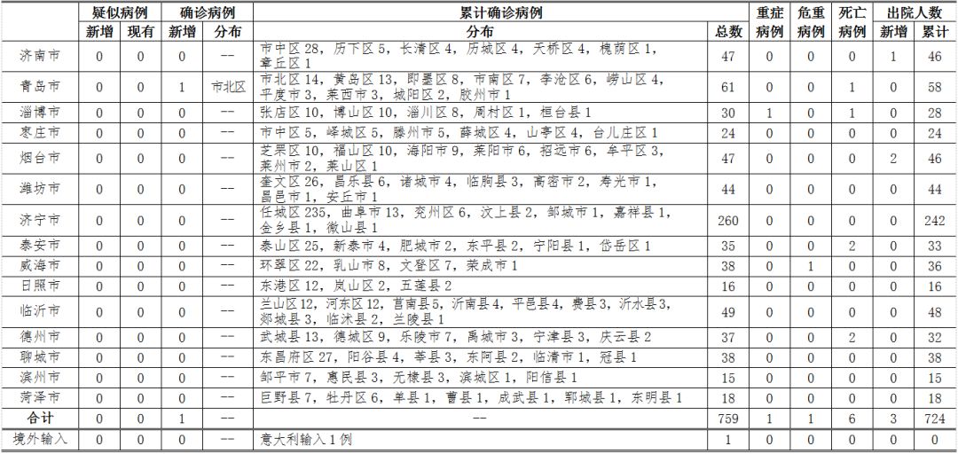 ??????備注:境外輸入病例單獨統計,其他病例按確診時醫院所在縣區統計。(來源:健康山東)