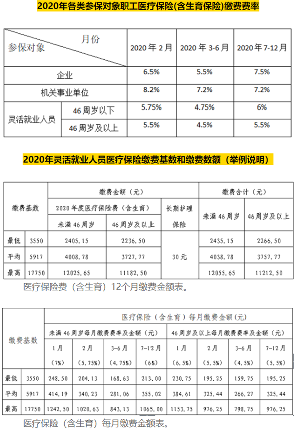 靈活就業人員職工醫保繳費費率調整為:46周歲以下人員,2020年2月為5.75%,3月至6月為4.75%,7月至12月為6%;46周歲及以上人員,2020年2月為5.5%;3月至6月為4.5%;7月至12月為5.5%。