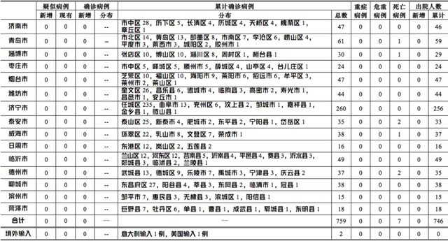 ??????2020年3月17日0-12時,山東省本地無新增確診病例,無新增疑似病例,累計報告確診病例759例。無重癥病例、危重癥病例;累計死亡病例7例;無新增治愈出院病例,累計治愈出院746例。
