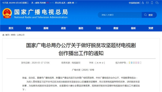 ??????根據(jù)《國家廣電總局辦公廳關(guān)于做好脫貧攻堅(jiān)題材電視劇創(chuàng)作播出工作的通知》要求,脫貧攻堅(jiān)重點(diǎn)劇目在各級電視臺特別黃金時(shí)段優(yōu)先排播,各級電視臺拿出重點(diǎn)頻道和時(shí)段,做好重點(diǎn)劇目播出和宣傳,省級衛(wèi)視黃金時(shí)段優(yōu)先排播重點(diǎn)劇目,重點(diǎn)劇目播出時(shí)統(tǒng)一在劇名畫面中加“國家廣播電視總局脫貧攻堅(jiān)重點(diǎn)劇目”標(biāo)識。
