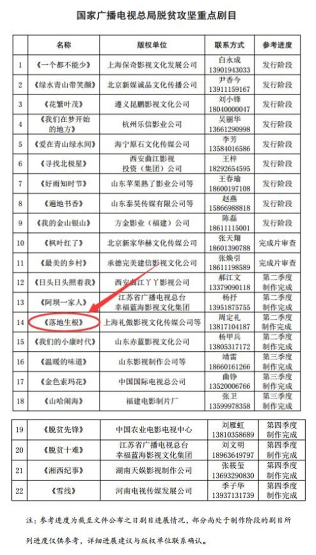 ??????3月17日,國家廣播電視總局公布了22部脫貧攻堅(jiān)題材重點(diǎn)電視劇劇目名單,由南海新區(qū)管委、山東衛(wèi)視傳媒、上海禮傲影視文化傳媒、涅磐文化傳媒(上海)、山東屹能市政工程聯(lián)合出品的電視劇《落地生根》名列其中。