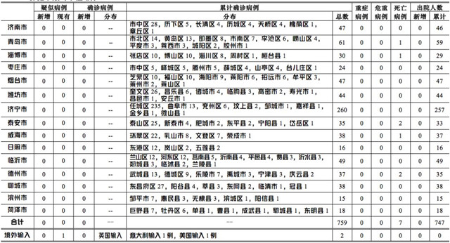 ??????2020年3月19日0-12時,山東省本地無新增確診病例,無新增疑似病例,累計報告確診病例759例。無重癥病例、危重癥病例;累計死亡病例7例;無新增治愈出院病例,累計治愈出院747例。
