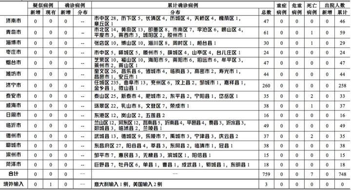 ??????2020年3月20日0-12時,山東省本地無新增確診病例,無新增疑似病例,累計報告確診病例759例。無重癥病例、危重癥病例;累計死亡病例7例;無新增治愈出院病例,累計治愈出院748例。