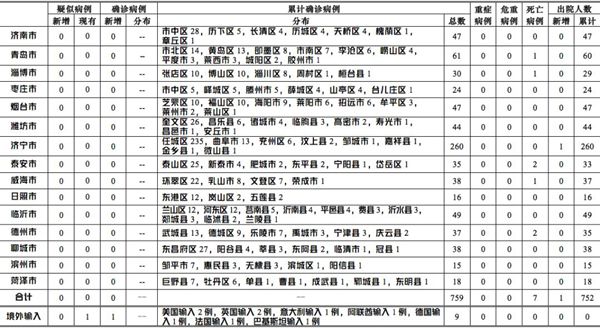 ??????2020年3月23日0-12時,山東省本地無新增確診病例、疑似病例,累計報告確診病例759例。無重癥、危重癥病例;累計死亡病例7例;新增治愈出院病例1例,累計治愈出院752例。