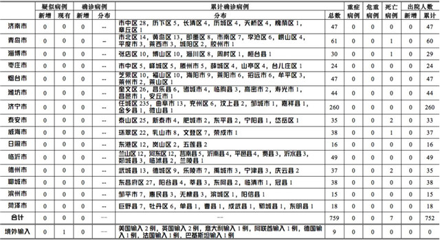 ??????2020年3月24日0-12時(shí),山東省無(wú)本地住院疑似病例、確診病例。累計(jì)報(bào)告確診病例759例,死亡病例7例,治愈出院752例。