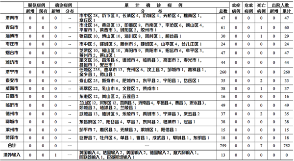 ??????2020年3月27日0-12時,山東省無本地住院疑似病例、確診病例。累計報告確診病例759例,死亡病例7例,治愈出院752例。