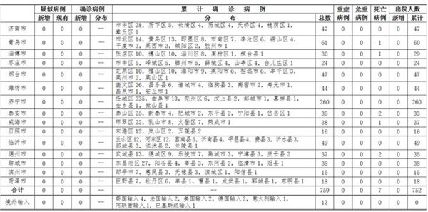 2020年3月28日12-24時,山東省無本地住院疑似病例、確診病例。累計報告確診病例759例,死亡病例7例,治愈出院752例。