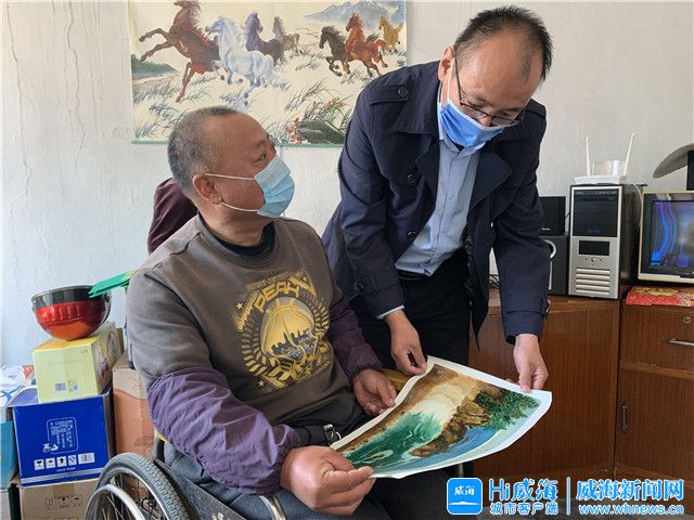 ??????4月13日上午10點半,陽光明媚。在文登區葛家鎮生格莊村民夏擁軍家中,他正坐在輪椅上,一手撐著畫板,一手拿著畫筆,旁邊的板凳上調色盤、顏料亂中有序地擺放著。他抬頭看看窗外,低頭描上幾筆,畫紙上門前的那棵老棗樹漸漸顯現。