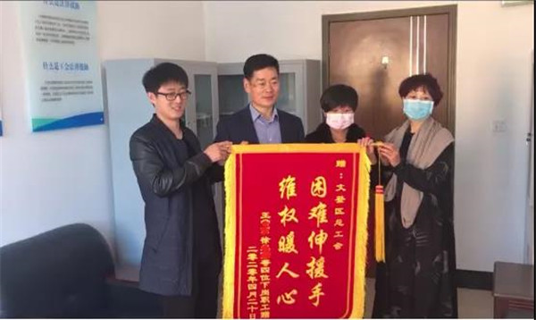 “感謝區(qū)總工會幫了我們大忙,為我們普通職工解除了后顧之憂,再過一段時間我們就可以領(lǐng)退休金了,這下后半生有保障了。”2020年4月20日上午,王某某、徐某某等2名下崗職工代表手持錦旗來到區(qū)總工會表示感謝。