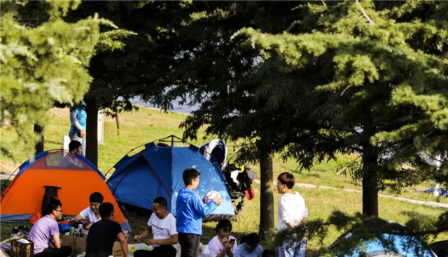 ??????游客行走在銀杏林中,感受著大自然的饋贈。在銀杏林中徜徉,感嘆大自然的神奇。累了,在這里來一場露營,好不愜意。