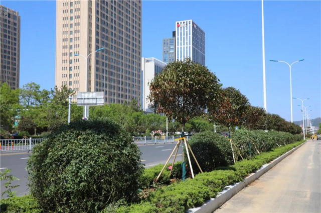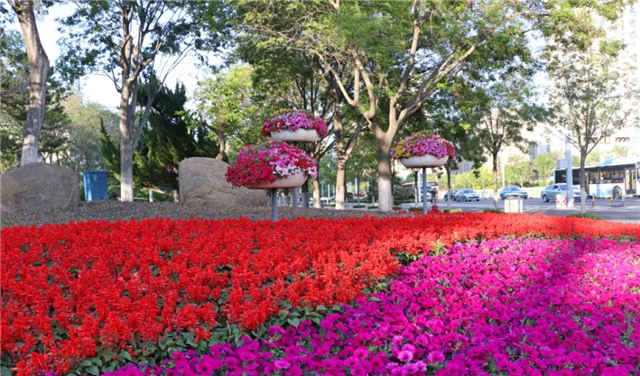 紫薇花瓶、多彩月季、紅葉石楠高低錯落、色彩斑斕,為文化西路增添了幾分浪漫。