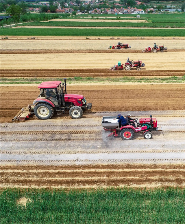 ??????5月14日,在山東省榮成市虎山鎮北寨子后村,合作社的工作人員駕駛農機種植春玉米。