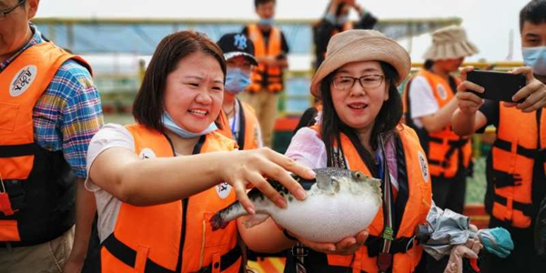 ??????6月17日上午,采風團來到愛連灣旅游度假村,實地參觀調研愛連灣海洋牧場。立體化海洋牧場的建設直接帶動了水產苗種培育、水產品精深加工、漁業休閑旅游等產業快速發展,奏響了一曲深耕碧海、牧漁未來的“海上牧歌”。“外地游客對威海現撈現吃的海鮮情有獨鐘,愛連灣海洋牧場的海產養殖、海鮮打撈、免費加工、海上行走、海上垂釣等多種海上休閑項目,深受海內外游客歡迎。”有著7年旅行社經驗的威海中旅集團地接部經理楊曉翠告訴記者。?