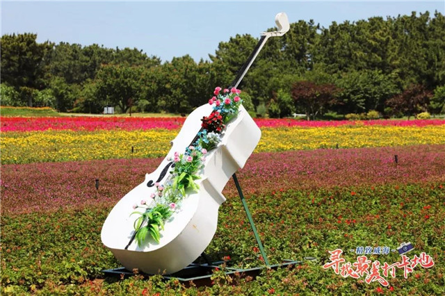 藍(lán)白相間的風(fēng)車守望著這片“彩虹花海”,不遠(yuǎn)處的大提琴雕塑和白色木船,一切都那么自然,仿佛是一幅觸動(dòng)心靈的唯美的畫作!美,原來(lái)可以這樣搭配。