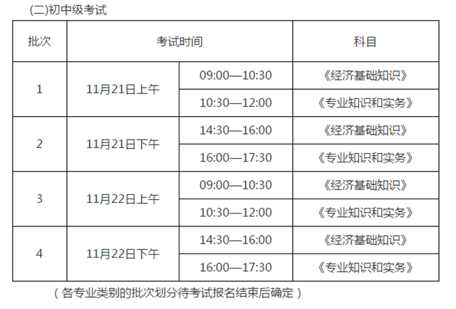 ??????初中級考試于11月21日、22日舉行,分兩天上、下午4個批次實施。各級別及專業類別的具體考試時間和批次劃分視報名情況另行確定。具體安排如下:
