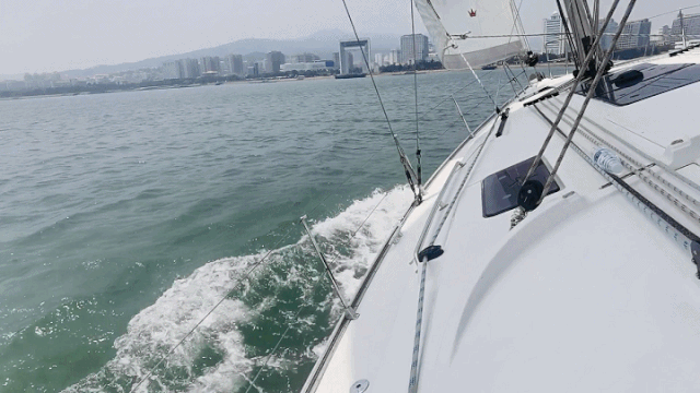 ????駛出碼頭,風不是很大,帆船跟著風的方向在海上航行。站在船頭的位置,感覺自己就像是勇闖天涯的海賊王,充滿野性又美麗的大海就在跟前!整個人被海浪海風環繞,感受著波濤起伏的別樣趣味。