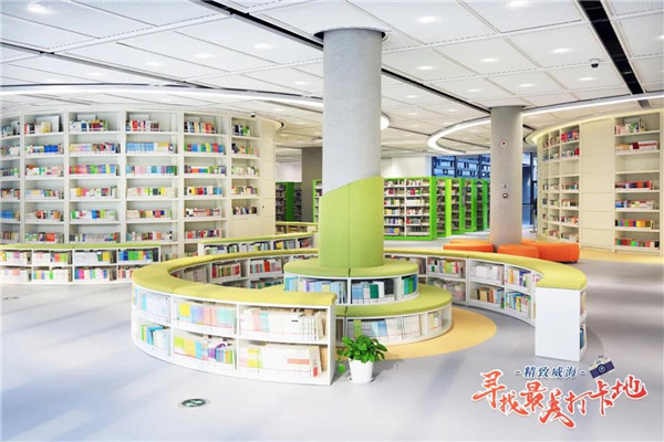 圖書館最具有設計感的樓層,便是連接五、六樓的“書山”,沒錯,就是用書籍壘起的“高山”,有著“書山有路勤為徑”的寓意,這里也是整個圖書館最佳觀景平臺。