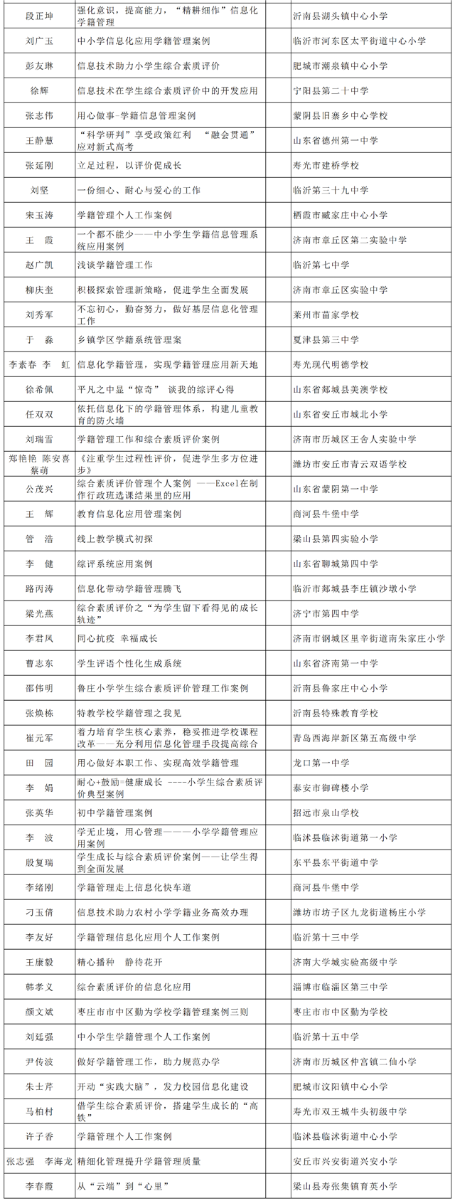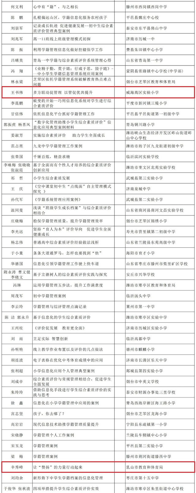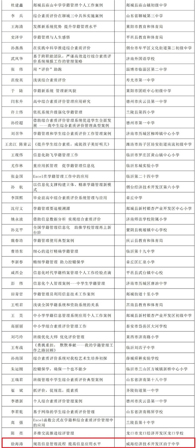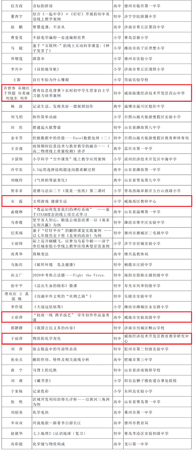??????根據(jù)《山東省教育廳關(guān)于舉辦2020年全省中小學(xué)實(shí)驗(yàn)教學(xué)說(shuō)課和信息化典型示范案例征集活動(dòng)的通知》要求,經(jīng)各市推薦,通過(guò)網(wǎng)上申報(bào)、專家評(píng)審等程序,最終確定線上教學(xué)82項(xiàng)、信息化管理177項(xiàng)為省級(jí)典型示范案例,威海17項(xiàng)案例上榜!現(xiàn)予以公示,公示期為2020年9月21日至2020年9月25日。