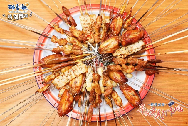????蒜香十足的烤扇貝、鮮嫩爆汁的烤生蠔、垂涎欲滴的烤海腸、油而不膩的烤海螺、口齒留香的烤鲅魚……50多種燒烤菜品可以滿足每一個挑剔的胃,剛出爐的燒烤放在紅色烤瓷盤里,讓人吃上第一口就忍不住感慨:“就是這個味兒!”