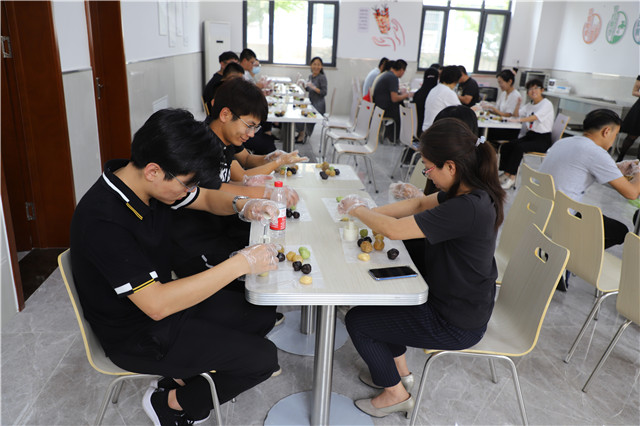 下午,全體干部職工在職工食堂開展自制月餅活動,喜迎仲秋佳節。揉面、包餡、揉圓壓扁,再壓模等制作工序有條不紊,職工配合默契,一個個精致誘人的月餅便出爐了,吃著自己親手制作的月餅,講述著仲秋佳話,幸福的笑容洋溢在臉上,氣氛融融、和諧美滿。