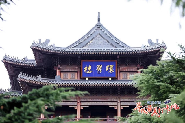????蒼松翠柏之間的環(huán)翠樓,是一座十字對稱的明清塔式仿木結(jié)構(gòu)樓閣式建筑,琉璃瓦覆蓋的樓頂、歇山式層檐、雕花縷空窗……傳統(tǒng)中式建筑的美在環(huán)翠樓身上皆可窺見一二。