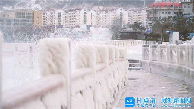 輕盈的雪花落滿了威海大地,在海邊的護欄處,形成了一個個晶瑩剔透的冰凌掛,意境唯美,猶如進入了童話般的冰雪世界。