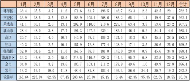 汛期全市平均降雨量535.7毫米,環(huán)翠區(qū)428.2毫米、文登區(qū)568.3毫米、榮成市609.3毫米、乳山市594.8毫米,高區(qū)388.2毫米,經(jīng)區(qū)396.1毫米,臨港區(qū)442.8毫米,臨港新區(qū)588.2毫米。全市汛期平均降雨量較歷年同期(541.6毫米)偏少1.1%,較2019年汛期(292.3毫米)偏多83.3%。