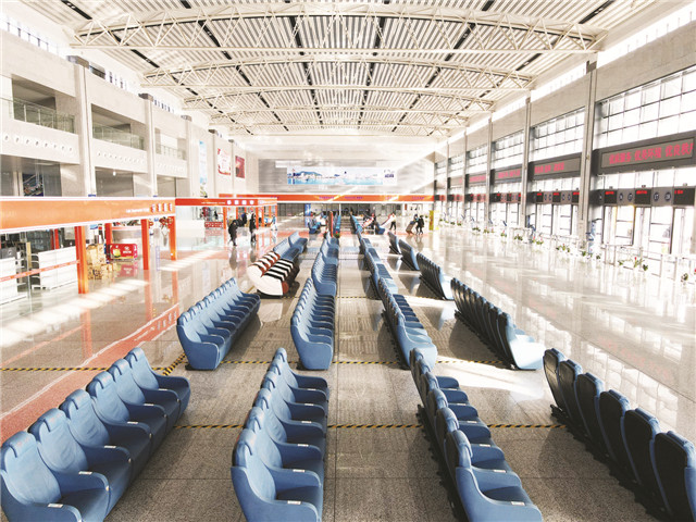 ??????長途客運站建筑總面積為4.3萬平方米,包括車輛進(出)站通道、卸貨落客區、接發貨區、售票大廳、候車大廳、發車區、停車場等功能區。其中,售票大廳設有7個售票窗口和自助售取票機,設施功能齊備完善。候車大廳檢票臺設有27個檢票口,1至12號口為跨區長途班次檢票口,13至27號為區內短途班次檢票口,旅客可根據客票票面所示的檢票口到檢票口檢票乘車。