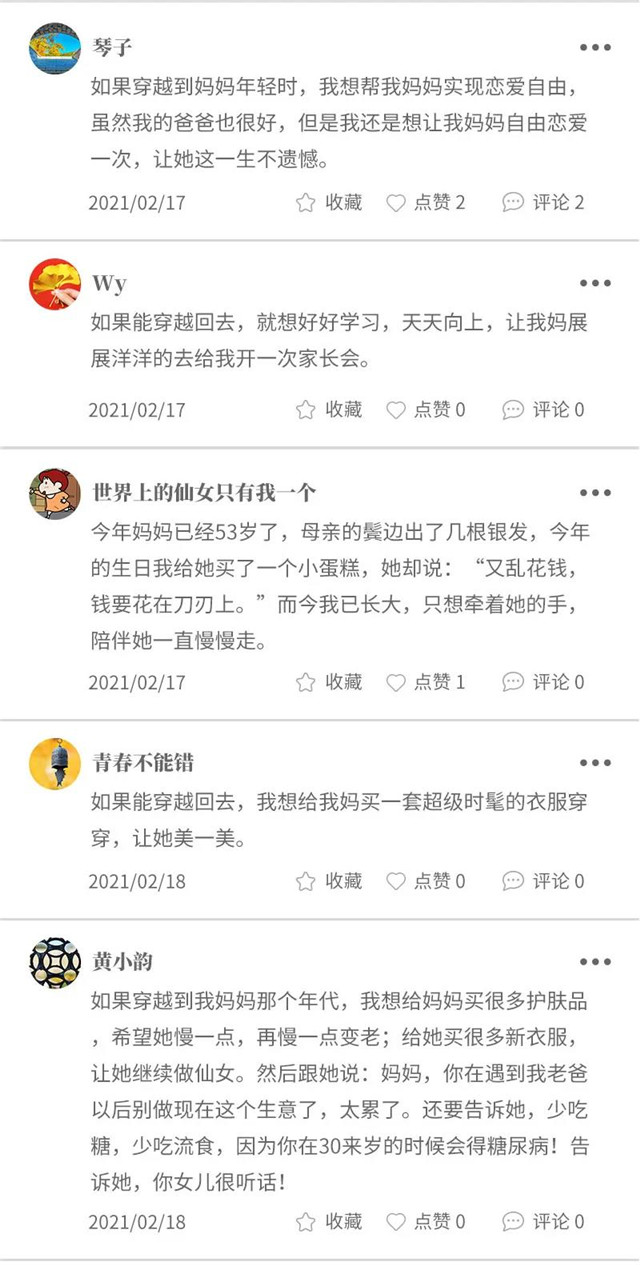 ??????原來媽媽們也曾是花季少女,也曾驚艷了一段時光。如果你有一次機會能夠穿越到媽媽年輕時,你最想對媽媽說(做)什么?