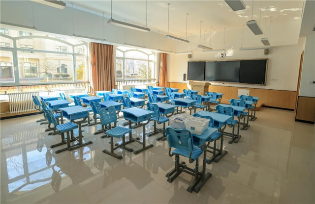 ??????新校區的6棟教學樓里,每個教室均配有中央空調及水暖系統,并全部配套了先進的多媒體教學設備。其中,學生教室安裝希沃教學大屏一體機加變軌黑板,實驗班教室采用智慧納米黑板,每個教室都安裝點名球,依托AI課堂學情分析系統,實現智能教學互動與管理。有15個教室安裝了雙師課堂,利用網絡互動視頻直播技術,將教育與信息化科技相結合,實現一師授課,其他教室的老師負責管理、答疑等全新的教學模式,是榮成市唯一一家配備這種先進技術設備的學校。