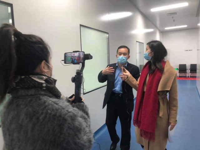 一家企業(yè)負(fù)責(zé)人(中)線上向求職者展示工作環(huán)境。 紀(jì)哲 攝