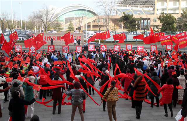 ??????典禮結束后,舉辦了“黨史宣傳教育”為主題的快閃活動,串唱紅色歌曲,現場打出“學黨史 悟思想 辦實事 開新局”標語牌等。