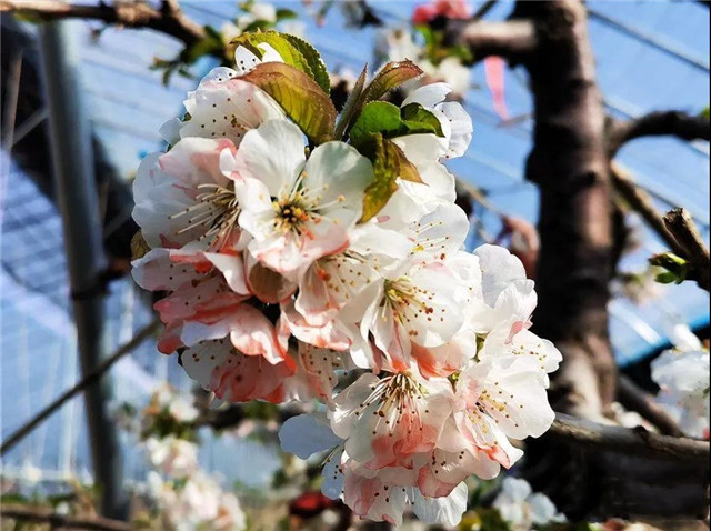 ??????在太公緣農耕部落北面不遠處的白鹿村,威海仙果仙園現代農業科技股份有限公司已經在院內種上了6個大棚的櫻桃樹。這里的櫻桃樹長勢喜人,滿目綠葉,郁郁蔥蔥,櫻桃花如同簇簇白雪綴滿枝頭。