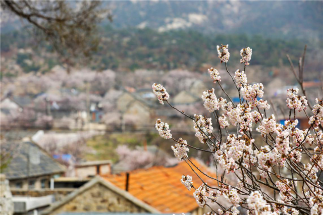 萬畝櫻桃花競相開在連綿的青山腳下,滿眼春光,和著小橋流水和裊裊炊煙,像一幅徐徐展開的田園畫卷。