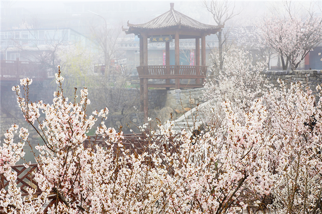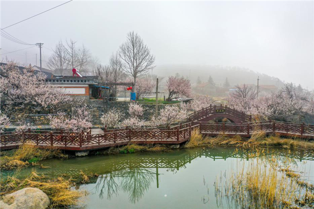 淺淺的霧靄像是絲帶纏繞在山間,粉色的櫻桃花擁擁簇簇開滿山腳,置身其中,讓人忍不住向往劈柴喂馬的詩意生活,與煙波共瀲滟,伴云花共逍遙。