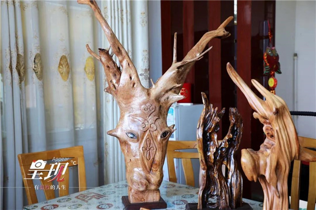 ??????郭友之的家里到處擺放著根雕,經過20多年的潛心創作,現在已經積累了100多件滿意的作品,這些仿佛都成為了他生命里見證時光的標點。