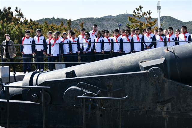 下午2點,當日課程正式開始。參加活動的50余名學生登上東泓炮臺,跟隨現場講解回顧甲午戰爭的慘痛教訓;隨后,同學們又來到總體國家安全觀教育展館,在參觀學習中反思近代以來國家安全歷史教訓,了解新中國成立以來為維護國家政治、經濟、軍事、科技、文化等安全作出的偉大實踐,將堅持總體國家安全觀的理念根植心中。