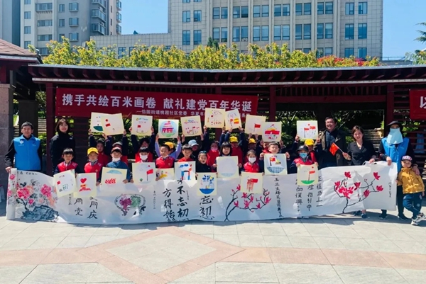 ??????日前,高新區桃園社區新時代文明實踐志愿服務隊攜手轄區共建單位華夏書畫社組織開展“攜手共繪百米畫卷 獻禮建黨100周年”活動。活動以青少年共同創作百米畫卷形式,展現黨的光輝成就,運用藝術語言表達了對祖國、對家鄉、對傳統文化的熱愛。