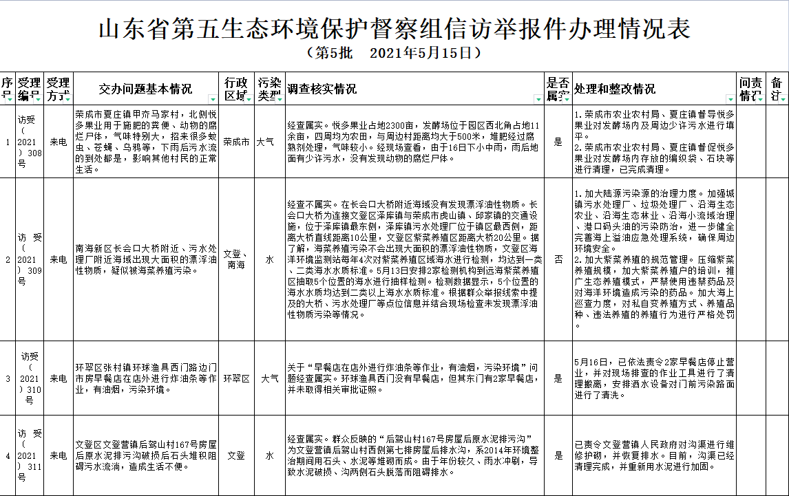 ???山東省第五生態環境保護督察組向我市交辦第五批信訪件共計59件(重復件4件)。截至5月22日12時,已全部辦結。其中屬實53件(重復件4件),不屬實6件。