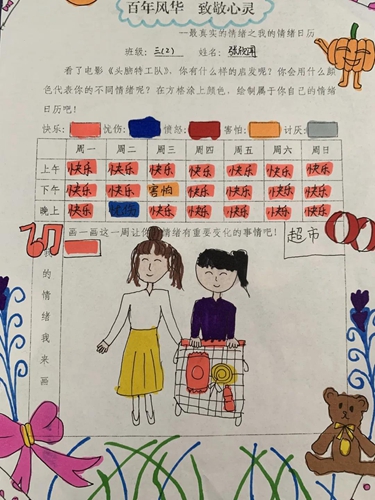 ????情緒是一個人內心的感受,它是可以通過我們的身體呈現出來的一種生理的心理反應。心理學電影《頭腦特工隊》將快樂、憤怒、恐懼和厭惡做擬人化處理,孩子們有感而發賦予色彩以靈魂,選擇自己的情緒顏色,在紙上用線條、圖形、顏色、文字等各種形式表達出自己不同的情緒……