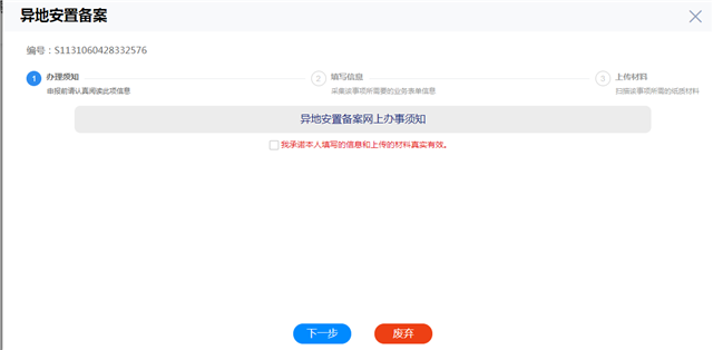 ????該業(yè)務(wù)的辦理分為三步,分別是辦理須知、填寫信息、上傳材料。首先點擊“我承諾本人填寫的信息和上傳的材料真實有效”,然后點“下一步”。