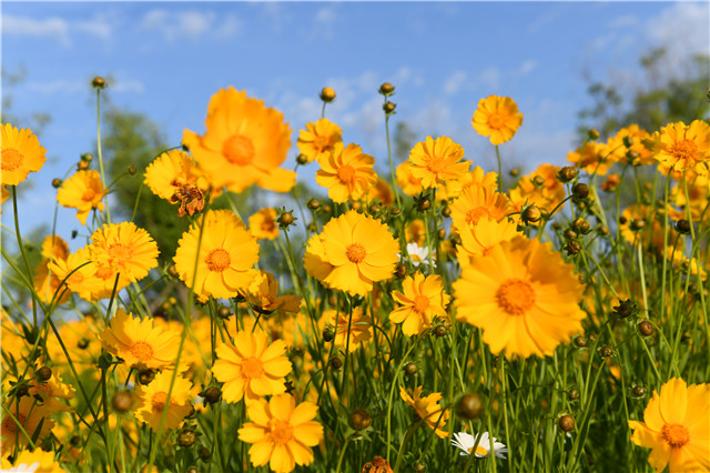 ??????近日,天氣晴朗溫度適宜,襲襲微風中,金雞菊次第開放。綻放的金雞菊在陽光下的照射下金黃明亮、充滿活力。風起時,花浪一浪接著一浪,閉上眼,微風攜來陣陣幽然的花香,令人沉醉。