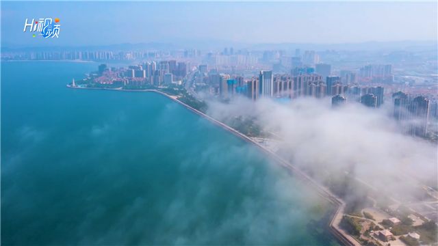 ??????近日,威海海邊出現(xiàn)平流霧景觀,城市的公園、山巒、樓宇在平流霧中若隱若現(xiàn),宛如仙境。