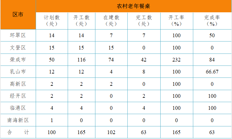 ??????目前,全市的農村老年餐桌建設項目已經全面啟動,截至今年的5月底,已開工建設165處(較年初計劃增加65處),其中正在建設102處,完工63處,完工率63%。