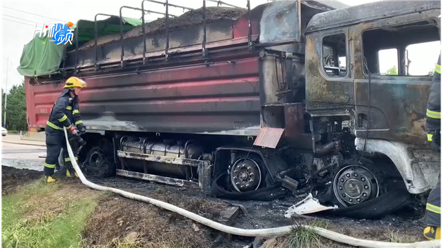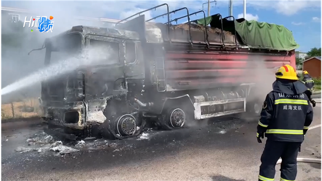 7月19日,途經文登區宋村鎮北馬村公路附近的一輛大貨車不明原因著火,轄區廣州路消防救援站立刻出動趕往事發地點進行救援。