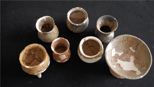 ??????15座石棺墓出土陶器、石器共計42件。其中出土陶器37件,石器5件,器形有陶鼎、陶罐、陶碗等。