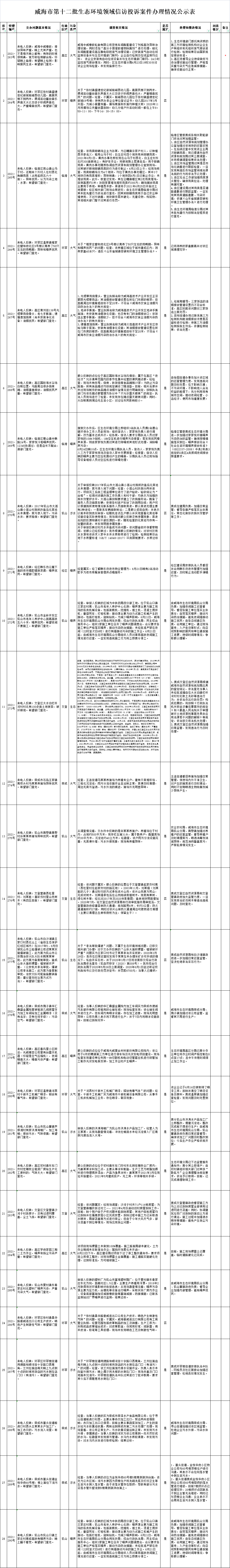 ??????威海市第十二批生態環境領域信訪投訴案件交辦清單共計28件。截至7月31日17時,已全部辦結。其中屬實23件,不屬實5件。